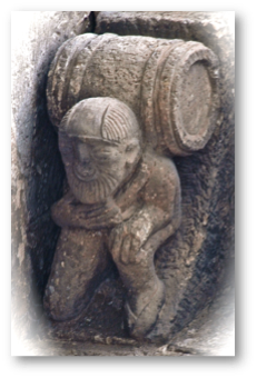 Continuando con la descripción iconográfica de la serie de canecillos que se encuentran ubicados en el alero del ábside, nos encontramos en primer lugar, en el Can. Abs. I, a un hombre llevando una barrica o tonelito a la espalda. Está sentado y parece ir desnudo. Cubre su cabeza con una especie de casquete que le llega hasta las orejas y calado hasta los ojos, pero que no parece el mismo con el que se cubren los monjes, ni tampoco lo es su fisonomía. Es barbado y de rasgos nada exagerados, solamente los ojos están más marcados. En actitud de descanso, reposa su mano izquierda sobre la rodilla mientras que la derecha descansa sobre su pecho. El tonel lo lleva ceñido a la espalda por medio de una serie de correas o tirantes que le pasan por debajo de los brazos.
