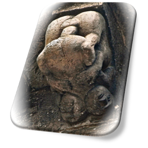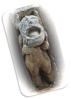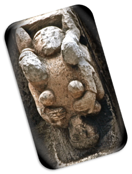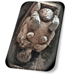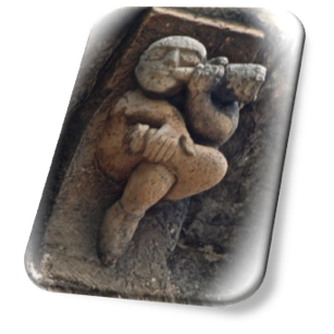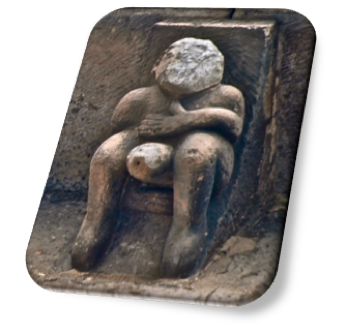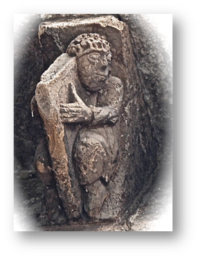 No obstante, y aunque no sería de extrañar este tipo de escena, puesto que aparecen otras en donde el coito o acoplamiento es patente, sí nos fijamos lateralmente, vemos como en realidad se trata sólo de una figura en postura un tanto forzada, por lo que nos inclinamos por la primera impresión tenida al verla. Por todo ello podríamos incluirla dentro de ese grupo de "clérigos juglares", que aparecen desnudos tocando algún tipo de instrumento, pues la forma en como se cubre la cabeza así nos lo indica. Es una pena el estado de erosión en que se encuentra, pues ello complica su lectura.