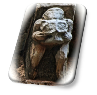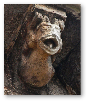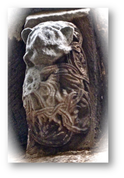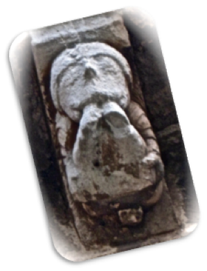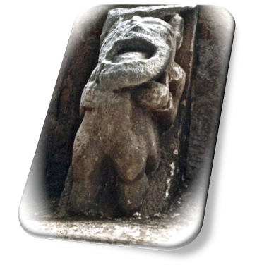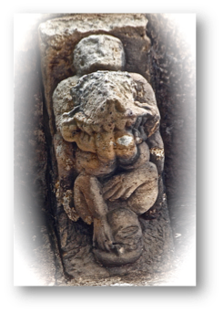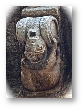 No nos cabe duda de que nos encontramos ante un monje o clérigo, pues todavía se pueden observar restos de la talla de lo que sería el traje talar, y lleva ese gorro tan característico de éstos, calado hasta los ojos y cubriéndole las orejas. De rasgos muy marcados, muestra unos ojos como desorbitados y nariz puntiaguda y prominente.