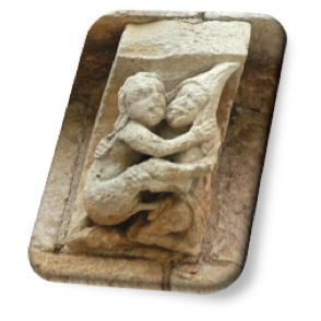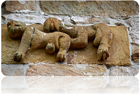 Por otro lado, por la bibliografía consultada, poco sabemos de la existencia de representaciones semejantes en iglesias de otros ámbitos geográficos, sólo a través de Gaignebet y Lajoux (GAIGNEBET, C. y LAJOUX, J.D.: Art profane et religión populaire au moyen âge, pág. 198-99) sabemos de la existencia de iconografía similar en algunas iglesias francesas, como es un canecillo del ábside de Saint-Cybard, en Verac; y otro de la iglesia de Saint-Christophe, en Courpiac. En ambos es también claro el acto que realizan, aunque la posición sea diferente a la que mantienen las parejas de nuestros canecillos; no obstante, y por lo que respecta a lo que ha venido en llamarse primitivismo de talla, la semejanza en el tratamiento de formas y volúmenes es clara, pues si bien ambos se encuentran muy erosionados, es indudable que los rasgos faciales de la pareja de Verac, de ojos almendrados y más o menos desorbitados, así como nariz, boca y ojos, son de un gran parecido con los que presentan nuestros protagonistas. (Ver reproducciones en: Ibídem, pág. 198)