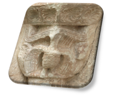 lateral izquierdo del mismo capitel aparece el motivo de dos cabezas humanas.; se completa la decoración de éste con una pequeña figura leonina en la parte central y superior del cuerpo del capitel, que volteando la cabeza parece mirar al águila.