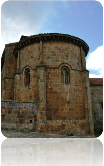 Exteriormente el ábside aparece dividido en cinco tramos, dos rectos, pertenecientes a los lados del presbiterio, y los otros tres curvos, los del semicírculo. Cada tramo está separado respectivamente por un contrafuerte prismático sosteniendo cada uno de ellos una columna con su respectivo capitel y albergando en total treinta y cuatro canecillos.