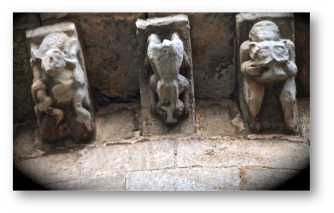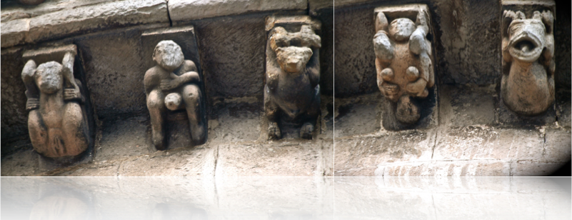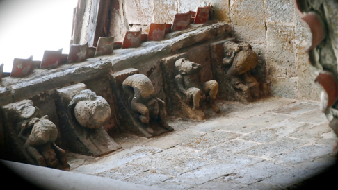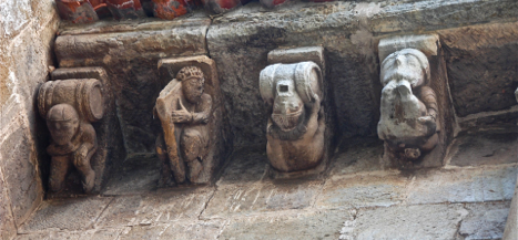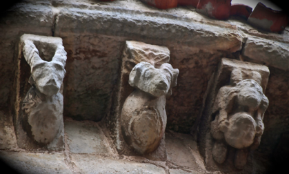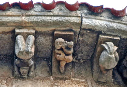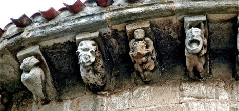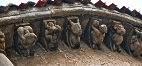 Por lo que respecta a la serie de canecillos que sostienen el alero del ábside, y en cuanto a su iconografía general, de izquierda a derecha, es la siguiente:
