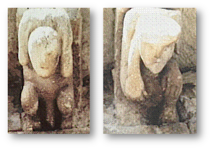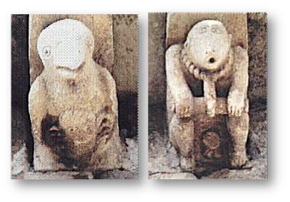 Can. Lint. N. XI: Dos figurillas semejantes a las anteriores, pero aquí están sentadas y de frente al espectador, en posición invertida, cabeza abajo.