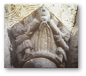 La clasificación que hacemos de esta figura, más que basarnos para ello en la figura en sí, es por la primera impresión que de ella se obtiene al contemplarla. Nos recuerda mucho a otra, así clasificada, del interior de la iglesia de Santa María de Siones, en el valle de Mena, en Burgos, en que aparece una figura femenina agarrando por los pelos a otra diablesca, que podría recordarnos a ésta.