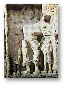 El relieve del lienzo Sur de la torre se trata de una placa empotrada en el muro en que podemos observar una composición de tres figuras. La del centro está sentada y lleva una larga túnica que le llega hasta los tobillos. Con el brazo derecho coge por encima de los hombros a otra figura, completamente destruida, que se encuentra de pie a su derecha. A su izquierda tenemos otra figurita muy pequeña vestida con una especie de faldellín que le llega hasta las rodillas, y parece que en su día pudo tener dos largos cuernos que desde el entrecejo se le dispararían a uno y otro lado de la frente. Si esto fuera así, nos encontraríamos ante una representación diablesca, pero por el estado de deterioro es muy difícil asegurar nada.