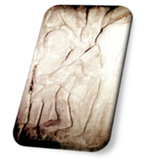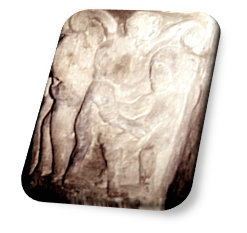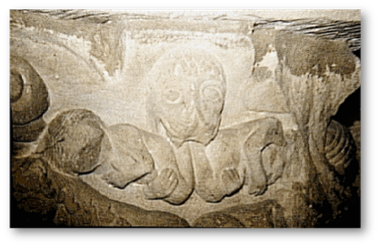 Cap. I Arq. Inf. Abs.: Personaje sedente portando en la mano derecha una especie de lanza cuya punta parece que se convierte en una flor de lis. Entre sus piernas se encuentra la figura de un niño con su mano derecha sobre el pecho, en actitud ritual. Se completa la escena con otras dos figuras.