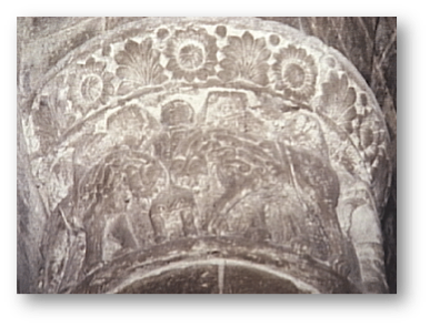 Cap. Drcho. Arc.Tr.: Comienza su decoración con motivo de piñas, a continuación dos leones parecen devorar a dos personajes desnudos