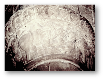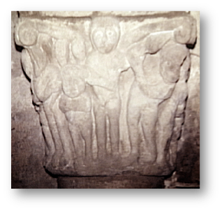 Cap. IV Arq. Inf. Abs.: Escena complicada del andrófago. Cuatro leones afrontados dos a dos en los esquinales. En la parte central superior del capitel, dos figurillas desnudas con una mano apoyada en el pecho y la otra en el muslo, salen de la boca de una cabeza monstruosa que los tiene ya sólo sujetos por los pies. En los laterales figura vestida parece salir de entre unas nubes y apoya una de sus manos sobre el lomo de uno de los leones.