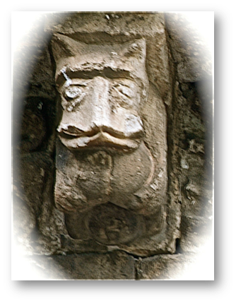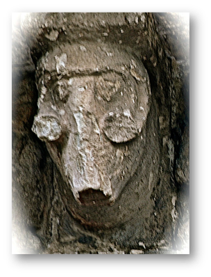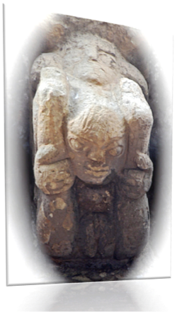 Aunque de rasgos itifálicos, éstos no están muy marcados, se puede decir que el escultor puso todo el acento en los rasgos del rostro, sobre todo en la boca que aparece completamente deformada, dándole esa apariencia antes mencionada, y en los ojos que son desmesuradamente grandes y como desorbitados. La nariz, de forma triangular y bastante prominente, le hace perder parte de su aspecto simiesco. Parece encontrarse, pues, en una actitud de esas consideradas como degradantes, y que abundan tanto en nuestra iconografía, hasta tal punto que es imprescindible hacer un gran apartado con todas ellas.