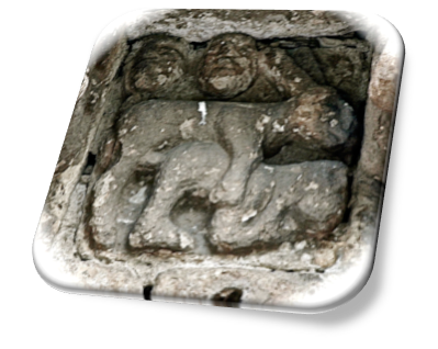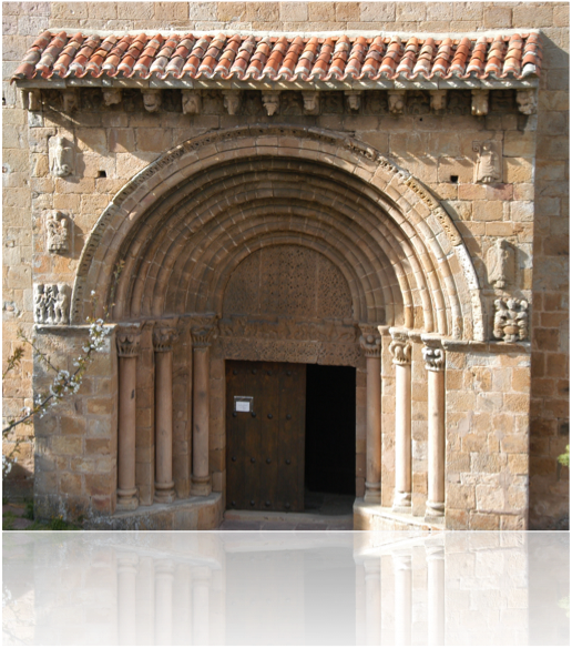 Entre el dintel de la puerta y el tímpano, que muestra una fina labor vegetal a trépano, de raigambre claramente oriental, se encuentra un friso de iconografía animalística en el que observamos tres pares de leones afrontados dos a dos.