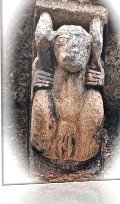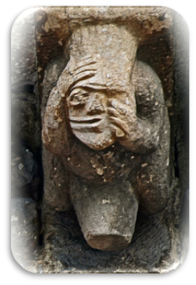 No cabe duda, como ya apuntamos, que muchas veces vemos aparecer hombres y mujeres desnudos simbolizando toda clase de vicios y de pecados, pero asociados a algún elemento que así lo indica, no obstante, en contraposición, en nuestra plástica nada existía que nos indicara otro tanto. En ninguna composición, o cerca de ella, podemos contemplar la imagen del demonio, o algún signo que nos estuviera hablando del castigo o del infierno, muy por el contrario, el contexto en que aparecen es otro, no sólo rodeadas por toda una iconografía que nos está hablando de muerte y renovación, sino que ambas representaciones es como si se complementaran, pues siempre esa mujer aparece acompañada, a izquierda o derecha, en el canecillo o capitel contiguo, de ese hombre, muchas veces en actitud un tanto solemne, y que ostenta un falo de tremendas proporciones en relación con las otras partes del cuerpo. Sin referirnos aquí a toda otra serie de representaciones, en donde el hombre, con características también itifálicas, aparece, pero no acompañando a esta mujer que ostenta su sexo, sino en otras actitudes, pero que no podemos dejar de mencionar, por ser muy abundantes en nuestra iconografía, y que después tendremos oportunidad de tratar.