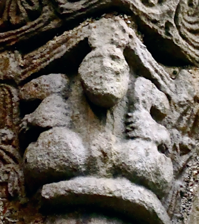 Tanto en el capitel izquierdo de la primera ventana del muro sur (izquierda) como en el capitel derecho de la primera ventana del ábside (derecha), vemos como éste se lleva las manos a ambos lados de la cabeza, como reposando todo su peso en ellas.