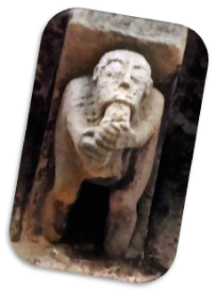 Y es que todo tipo de degradaciones desempeñaban un rol especial en estas fiestas de carácter religioso, en donde el pueblo revivía cíclicamente una serie de acontecimientos primordiales, pues otras actitudes, que también veíamos en nuestra plástica, siguen confirmándonos el papel que éstas desempeñaban. En algunos canecillos podíamos intuir la no menos degradante acción de defecar, o de llevarse la mano al trasero, y es que los excrementos jugaron también, desde los tiempos más antiguos, un papel importante, perviviendo dentro del espacio sagrado de la iglesia con motivo de la "fiesta de los tontos", cuando el obispo de la risa, durante el oficio solemne celebrado en la iglesia, utilizaba excrementos en lugar de incienso, luego, recorriendo las calles sobre una carreta repleta igualmente de la misma materia, los arrojaba sobre la concurrencia. (Ibídem, págs. 132-33) La razón de todo ello muy bien podemos verla en que, en aquella época, estos estaban asociados a la fecundidad, renacimiento y renovación, tienen un sentido ambivalente como toda la otra serie de imágenes de lo inferior material y corporal, pues rebajan y degradan por un lado, para dar a luz y renovar por el otro, como dice Bajtin: "… son a la vez benditas y humillantes." (Ibídem, págs. 1135-36)