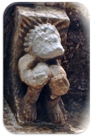 También en el canecillo nº IX del tejaroz, nos aparece otra figuraitifálica con los mismos rasgos, pero cuyo cuerpo corresponde completamente a un ser humano. Está sentado y se lleva la mano izquierda a la boca que muestra abierta en forma abocinada. Con la derecha, cubierta por la pierna, quizás pudiéramos intuir una mano muy erosionada que rodea el miembro viril, por lo que entonces se encontraría en actitud onanista.