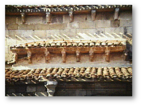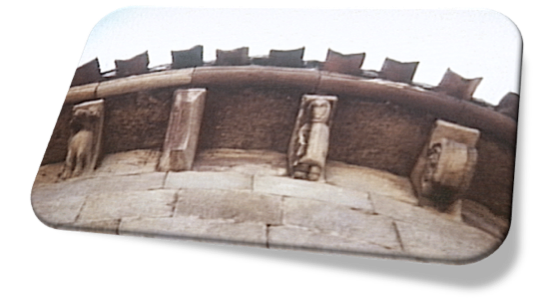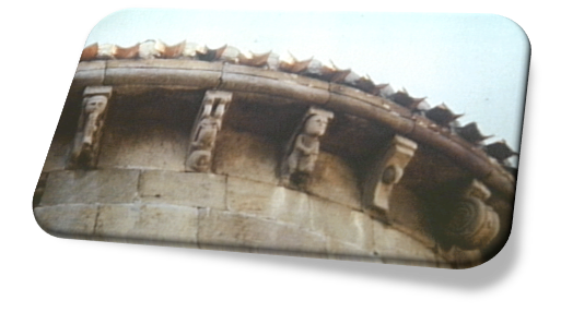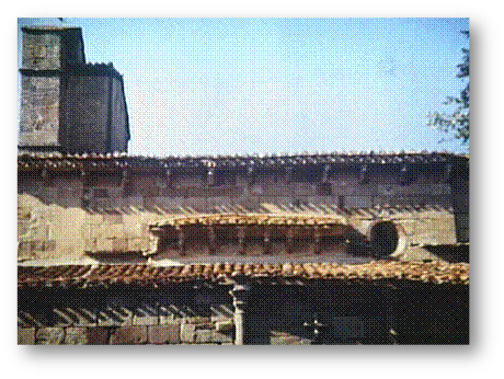 Ya pasando al muro Sur, su alero está sostenido por doce canecillos que guardan muchas semejanzas con los del tejaroz de la portada, anteriormente descritos. Unos van vestidos, otros desnudos, pero todos ellos van cubiertos con el mismo tocado, como si pertenecieran a una orden religiosa determinada. Las actitudes son las mismas que pudimos observar ya. Todos están sentados, o bien con las manos juntas, como entrecruzadas, a la altura de cintura en actitud de rezo, o bien sosteniendo algo entre ellas, como puede ser algunas veces un libro. Sólo dos de ellos no son iconográficos, Can. S. VIII y IX, y el VI que es de difícil identificación. También como novedad con respecto a los del tejaroz, es que aquí el último de la serie, Can. S. XII, parece que toca un instrumento, algo parecido a una especie de flauta.