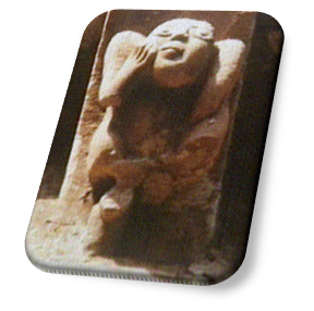 En el esquinal izquierdo una figura, vestida y sentada, parece tocar una especie de largo cuerno, y a su derecha, en el lateral izquierdo, se encuentran dos figuras humanas cuyas cabezas se sobreponen.