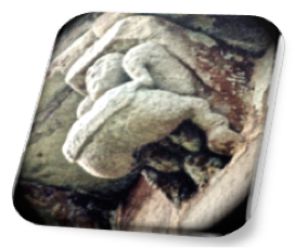 Ambas son robustas y con la cabeza encajada entre los hombros, como ya estamos acostumbrados a ver en esta iglesia. La mujer parece abrazarse a la figura del primer plano, posando su mano derecha sobre su mejilla, y la izquierda en su cuerpo. Su compañero sujeta contra su pecho un libro cerrado o tablilla, y con la mano derecha parece bendecir. Si bien es una composición cuya descripción es difícil, es más complicada a la hora de determinar lo que representa, y la bibliografía que la trata, 0083no nos apunta nada nuevo que no haya sido dicho sobre ella.