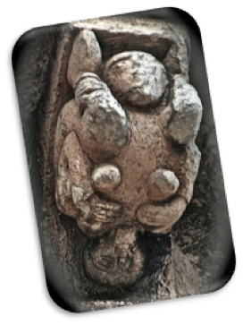 En el esquinal derecho nos encontramos ahora con una iconografía casi siempre privativa de exteriores, salvo algunas excepciones como aquí, que nos presenta a esa mujer con toca y desnuda, de piernas levantadas que se coge éstas por las corvas, y muestra sus órganos genitales, muy marcados y evidentemente hipertrofiados.