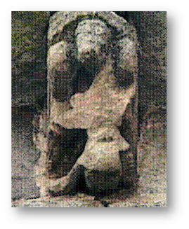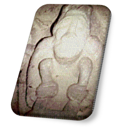 Pasando ya al Can. Abs. XXII, los anteriores no son antropomorfos, nos encontramos con una composición demasiado deteriorado para poder precisar con exactitud de qué se trata. En primer lugar no podemos afirmar si se trata de un hombre o de una mujer, pues el rostro se encuentra muy erosionado. Quizás podría corresponder a un ser barbado, lo que descartaría el que se tratara de un personaje femenino. Lo que si es cierto es que en primer plano nos aparece otra figura de rasgos más bien infantiles, cabeza abajo, que sonríe, y se cubre con un gorro o pequeño sombrero. Parece agarrarse a un pie de la figura sedente, pero poco más se puede decir de ellos, pues incluso el cuerpo, hoy en día completamente destrozado, no sabemos si pertenece a este pequeño personaje o al que se encuentra sentado. García Guinea lo interpreta como una escena de parto, pues representaría a una mujer dando a luz. Creemos que es demasiado aventurado clasificarlo de una manera concreta.